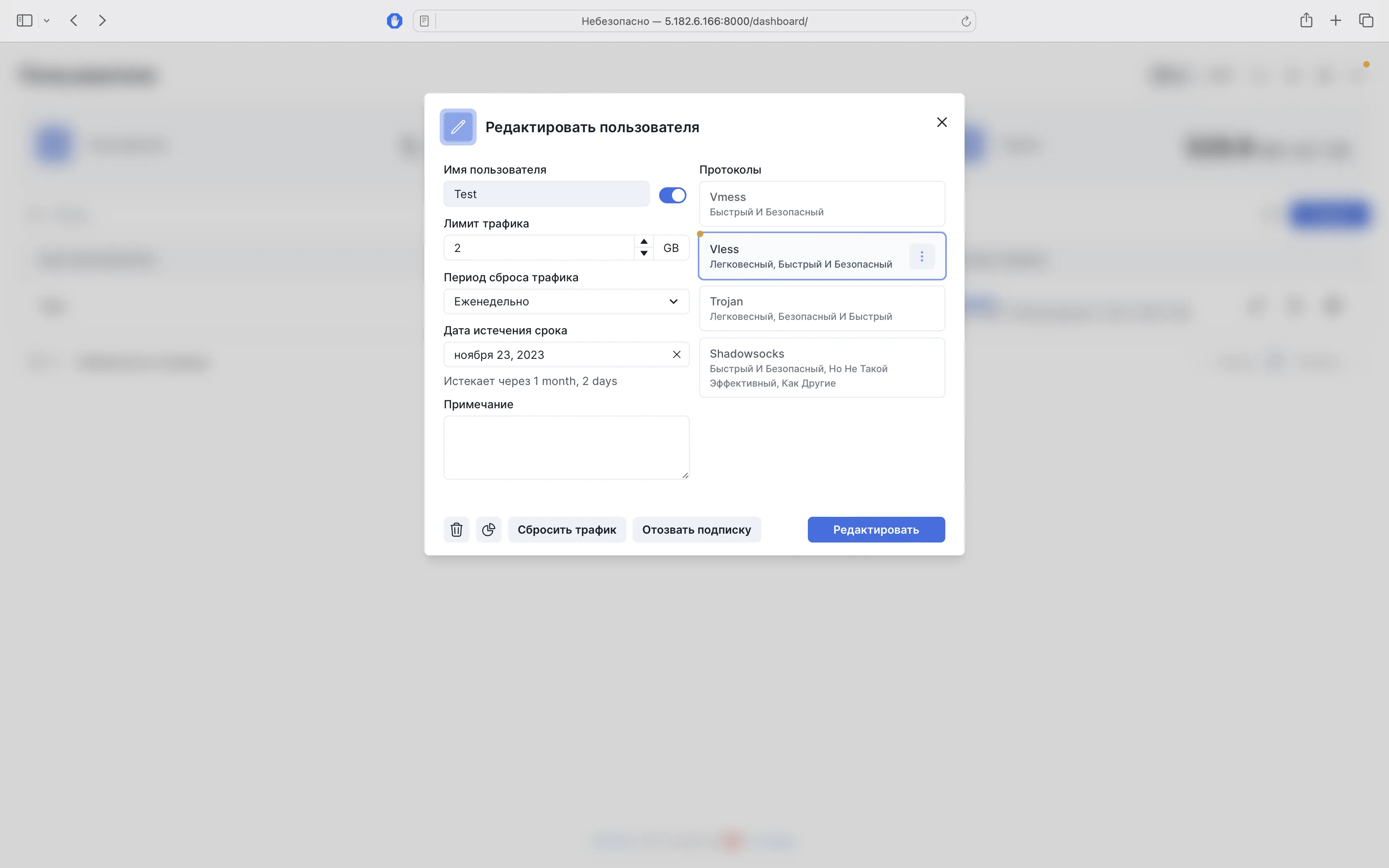 После создания пользователя Вам будет доступно редактирования его параметров, а так же дополнительные функции